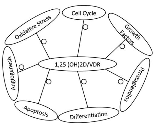 Growing tumors require a blood supply. 1,25(OH)2D inhibits angiogenesis by blocking the expression and function of VEGF (vascular endothelial growth factor),73-75 and mice lacking VDR had larger and more vascular tumors when implanted with prostate cells from TRAMP mice.76