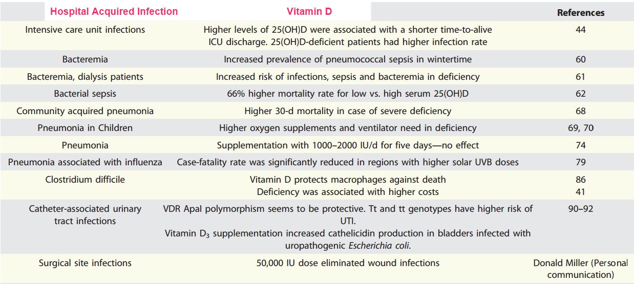 - Vitamin D, Hospital-Acquired Infections and Mortality in Critically Ill Patients: Emerging Evidence - 2017 https://doi.org/10.1007/978-3-319-51908-1_15 book chapter