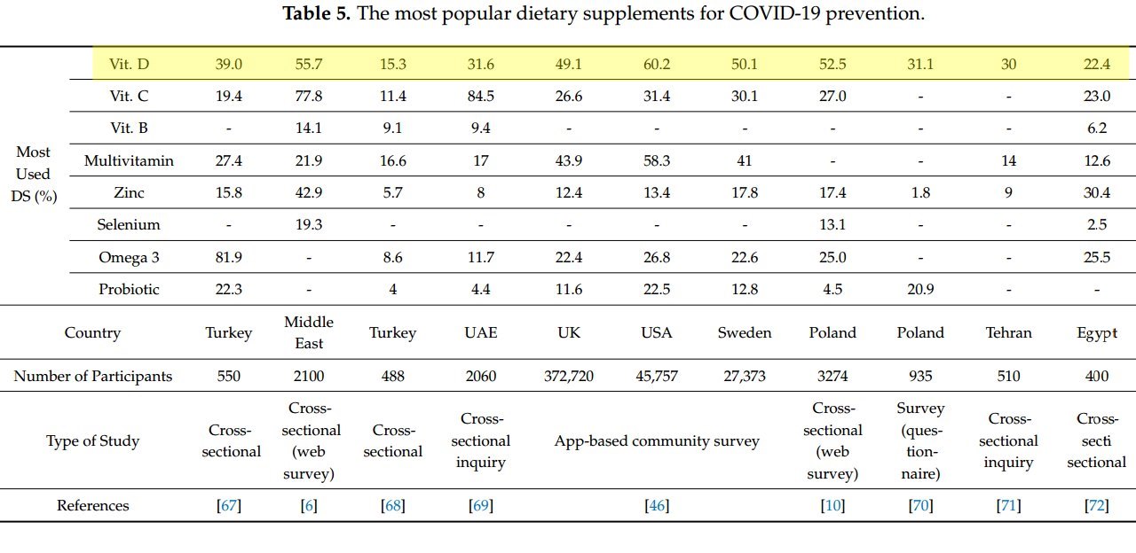 Over the last 20 years, the use of dietary supplements (DS) has continued to grow in many countries. Due to the public health crisis brought on by the COVID-19 pandemic and amidst fears regarding COVID-19 vaccines and their low supply in many regions of the world, there has been a marked interest in the use of DS as alternative means of protecting against and treating this emerging disease, as well as boosting the immune system and minimizing the risk of inflammation.
