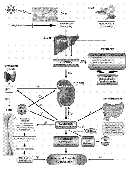 Osteoporosis is a skeletal disorder characterized by diminished bone strength, which results in an increased risk of fracture. Currently, osteoporosis is a public health priority due to the large number of individuals affected and the detrimental effect on quality of life. Primary osteoporosis, the most common form, usually results from age-related reduction in bone mineral strength. Over time, the individual's capacity to build bone is impaired, as the synthesis of vitamin D, the hormone responsible for calcium absorption, tends to decline. As serum calcium levels decrease, metabolic control serves to increase the removal of calcium from the skeleton to make up for the deficit. The synthesis of the 'hormone' vitamin D and its control therefore become central to intervention in involutional osteoporosis syndromes. In humans, plain vitamin D (cholecalciferol), also called parental or native vitamin D, is photosynthesized in the skin and then hydroxylated in the liver into the vitamin D analog calcidiol [25(OH)D3], which is hydroxylated again in the kidney into the vitamin D analog calcitriol [1,25(OH)2D3].