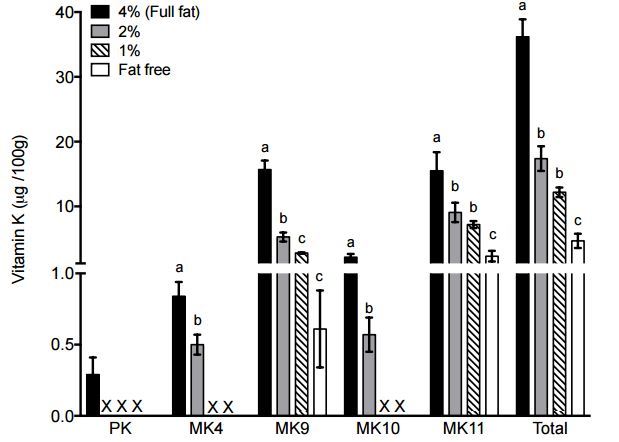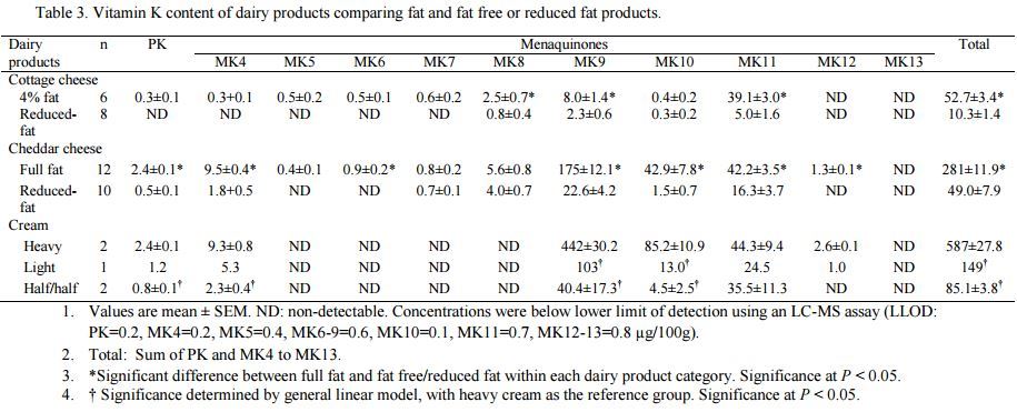 Conclusions: To the best of our knowledge, this is the first report of MK contents of U.S. dairy products. Findings indicate that the amount of vitamin K contents in dairy products is high and proportional to the fat content of the product.
