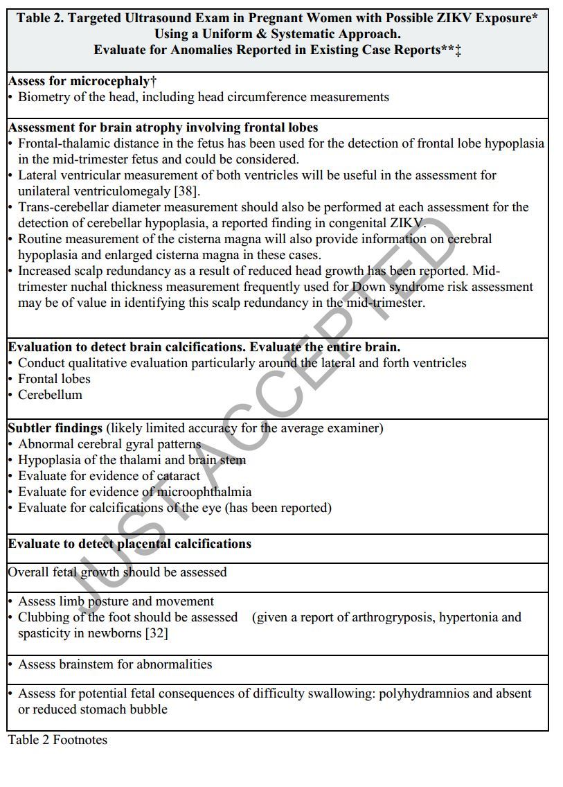 The CDC, Society for Maternal Fetal Medicine, and the American Congress of Obstetrics and Gynecology have all recommended ultrasounds in order to carefully evaluate the fetal brain and screen for other fetal anomalies in pregnant women who have been exposed to ZIKV, regardless of clinical symptoms or laboratory testing results [35, 37]. Serial US is recommended to detect microcephaly, intracranial calcifications or other fetal anomalies [35, 37]. It bears repeating that reduced brain growth can be associated with or occur in conditions with: