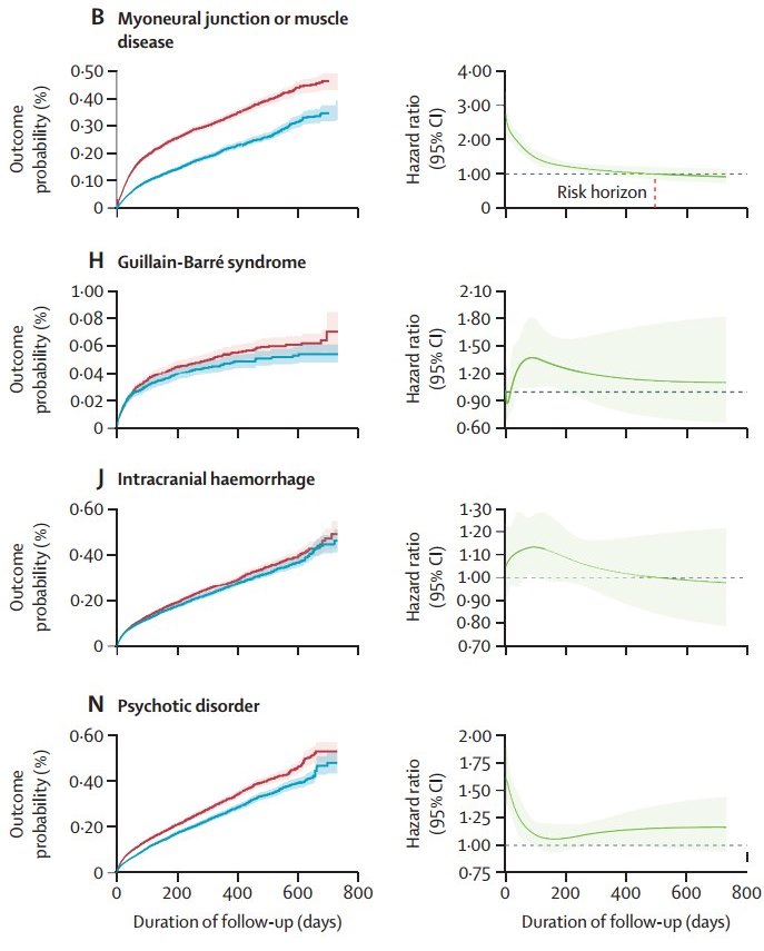 A cohort of patients of any age with COVID-19 diagnosed between Jan 20, 2020, and April 13, 2022, was identified and propensity-score matched (1:1) to a contemporaneous cohort of patients with any other respiratory infection. Matching was done on the basis of demographic factors, risk factors for COVID-19 and severe COVID-19 illness, and vaccination status. Analyses were stratified by age group (age <18 years [children], 18–64 years [adults], and ≥65 years [older adults]) and date of diagnosis. We assessed the risks of 14 neurological and psychiatric diagnoses after SARS-CoV-2 infection and compared these risks with the matched comparator cohort. The 2-year risk trajectories were represented by time-varying hazard ratios (HRs) and summarised using the 6-month constant HRs (representing the risks in the earlier phase of follow-up, which have not yet been well characterised in children), the risk horizon for each outcome (ie, the time at which the HR returns to 1), and the time to equal incidence in the two cohorts. We also estimated how many people died after a neurological or psychiatric diagnosis during follow-up in each age group. Finally, we compared matched cohorts of patients diagnosed with COVID-19 directly before and after the emergence of the alpha (B.1.1.7), delta (B.1.617.2), and omicron (B.1.1.529) variants.
