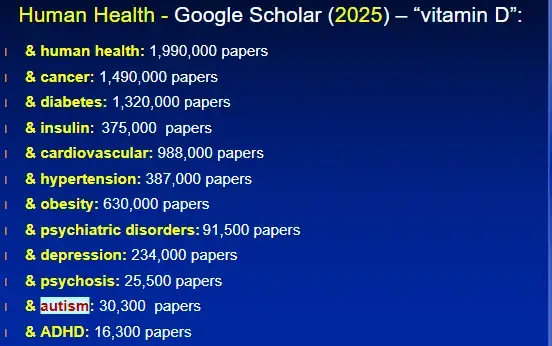(09:23) So the same article that I was mentioning here by Liu and Hewson also showed all those situations that you may have if you have low levels of vitamin D during pregnancy. And I would emphasize the maternal-fetal HIV transfer, autism, multiple sclerosis. just later on in this individual life. Type, the risk of diabetes in childhood if the mother had low levels of vitamin D during pregnancy, and asthma. And all those complications in pregnancy, you may have, if you have low levels of vitamin D during pregnancy. So you can imagine how much problems you may, the number, the amazing number of problems that you can prevent by just giving a pregnant woman an amount of 7,000 units of vitamin D per day, which is completely safe. It's important to say that some of our patients, MS patients, for instance, who were unable to get pregnant when they started receiving high doses of vitamin D, they got pregnant within a few months. So, and you have vitamin D and fertility, you have like more than 70,000 papers published related to that. As a neurologist, I'm really concerned about fetal brain development. And I see that patients who are having 7,000 to 10,000 units or even high doses of vitamin D, as we use in our protocol, the neurodevelopment of those children are amazing. It's amazing, amazing.