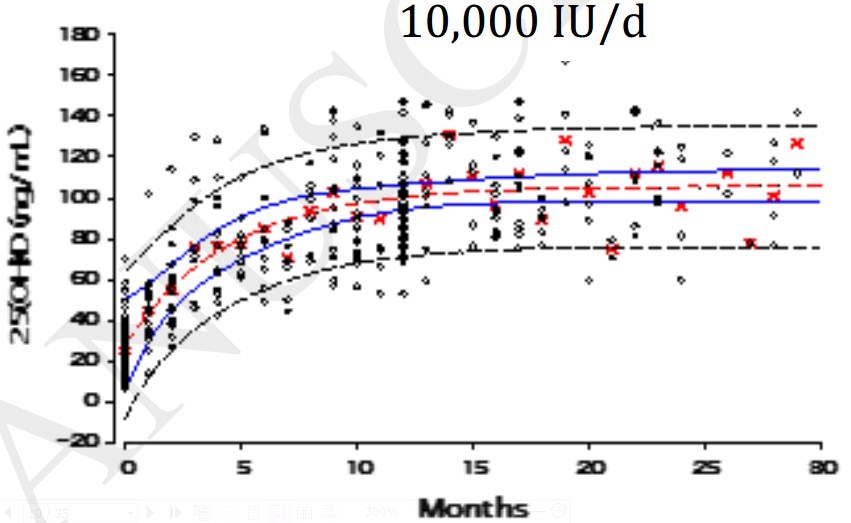 In this report, we will present 4 sets of data. The first will be a review of changes in 25OHD3, calcium and iPTH blood levels over time in patients who were on daily supplementation with either 5000 IU/d or 10,000 IU/d of vitamin D3 for at least 12 to 29 months. This is basically an extension of the work previously discussed published by Dr. Robert Heaney in 2003, who showed that this was safe over a period of 5 months (37).