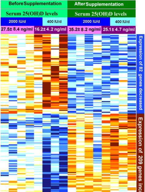 Vitamin D3 supplementation that improved serum 25-hydroxyvitamin D concentrations was associated with at least a 1.5 fold alteration in the expression of 291 genes.