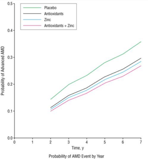 Antioxident vitamin or mineral supplements do not prevent age-related macular degeneration - "For those with category 3 or 4 macular disease, at 5 years from the onset of the study,