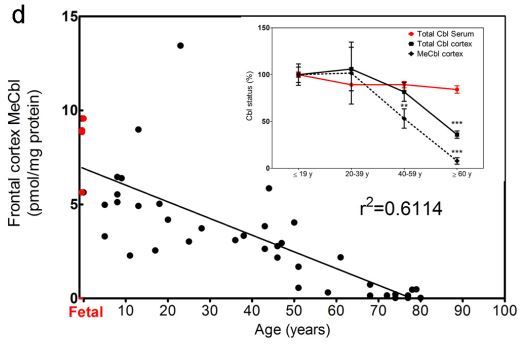 Total Cbl was significantly lower in older control subjects (> 60 yrs of age), primarily reflecting a >10-fold age-dependent decline in the level of MeCbl. Levels of inactive cyanocobalamin (CNCbl) were remarkably higher in fetal brain samples.