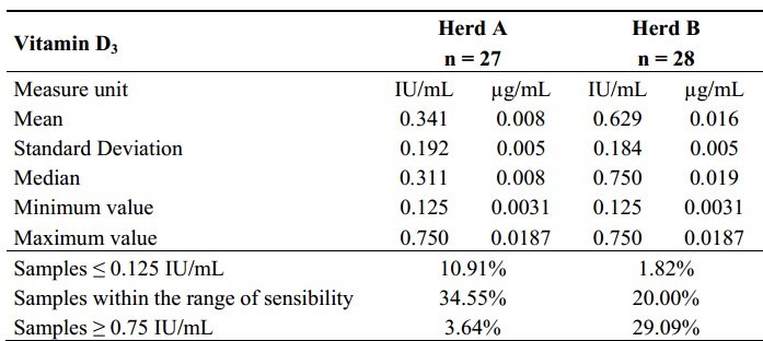The difference between herds (herd B vs. herd A: + 0.29 IU/mL corresponding to + 0.007 [jg/mL of vitamin D3) was significantly different (p < 0.0001). Table 1 shows the descriptive statistics of the quantification of vitamin D in the Italian Friesian individual milk samples analysed. Approximately 12.7% of the samples showed values of vitamin D3 less than or equal to 0.125 IU/mL, while the 32.7% of the samples showed values greater than or equal to 0.75 IU/mL. In the first case, the observations were concentrated in herd A, while in the second they were concentrated in herd B.