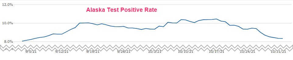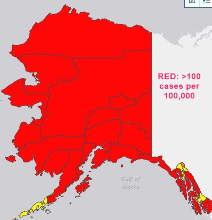 • "Alaska is leading the low-temperature states with an increase in the number of infections, with 123 new cases per 100,000 residents on a seven-day rolling average"