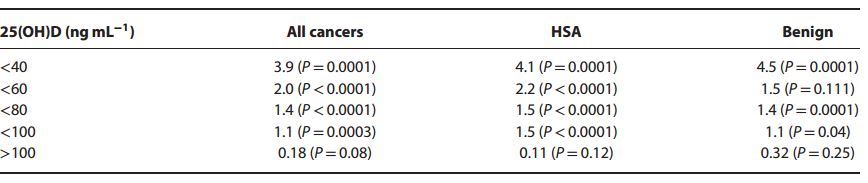 Relative risk of cancer increased with decreasing 25(OH)D concentrations [RR = 3.9 for 25(OH)D below 40 ng mL(-1) (P = 0.0001)]. Serum 25(OH)D concentrations in dogs vary widely, and are influenced by dietary VitD content. Serum vitD measurement can identify dogs for which supplementation may improve health and response to cancer therapy.