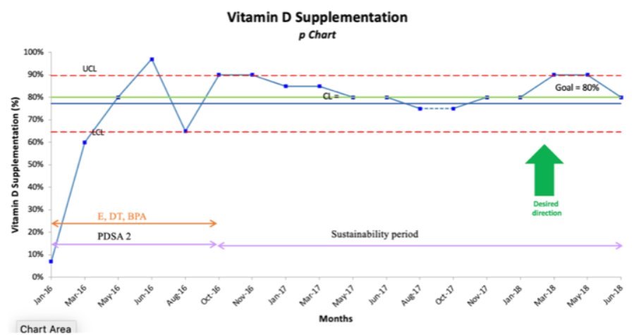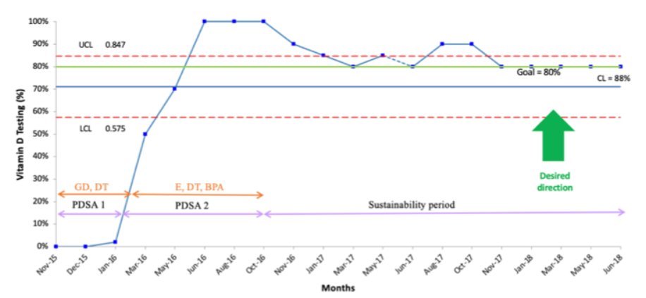 Methods: An inter-professional team reviewed baseline data, then developed and implemented interventions using Plan-Do-Study-Act (PDSA) cycles. Barriers were identified using QI tools, including lack of automated triggers for testing and inconsistent supplementation criteria and follow-up testing post-supplementation. Interventions included an institutional Vitamin D guideline, clinical decision-making tree for Vitamin D deficiency, insufficiency and sufficiency, electronic medical record triggers, and automated testing options.