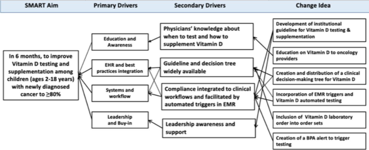 Background: Vitamin D deficiency and insufficiency have been associated with poorer health outcomes. Children with cancer are at high risk for Vitamin D deficiency and insufficiency. At our institution, we identified high variability in Vitamin D testing and supplementation in this population. Of those tested, 65% were Vitamin D deficient/insufficient. We conducted a quality improvement (QI) initiative with aim to improve Vitamin D testing and supplementation among children aged 2-18 years old with newly-diagnosed cancer to ≥ 80% over 6 months.