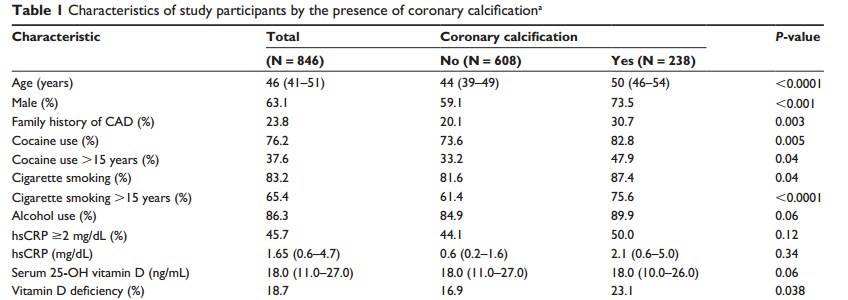 METHODS: CAC was quantified using a Siemens Cardiac 64 scanner, and vitamin D levels and the presence of traditional and novel risk factors for CAD were obtained in 846 HIV-infected African American (AA) participants aged 25 years or older in Baltimore, MD, USA without symptoms or clinical evidence of CAD.