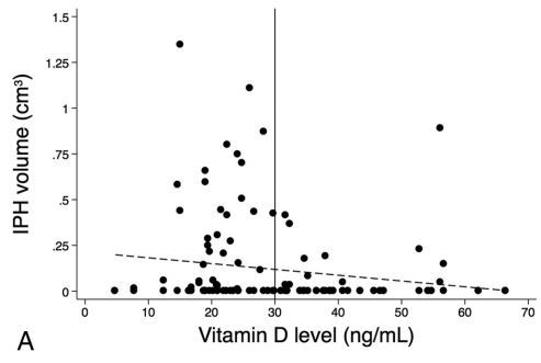 Low vitamin D levels (<30 ng/mL, prevalence ratio = 2.05, P = .03) were a significant predictor of MR imaging detected intraplaque hemorrhage, along with plaque thickness (prevalence ratio = 1.40, P < .001). MR imaging detected intraplaque hemorrhage volume linearly correlated with plaque thickness (partial r = 0.45, P < .001) and low vitamin D levels (partial r = 0.26, P = .003). Additionally, histology-detected intraplaque hemorrhage area linearly correlated with plaque area (partial r = 0.46, P < .001) and low vitamin D levels (partial r = 0.22, P = .03). The association of intraplaque hemorrhage volume with low vitamin D levels was also higher with ischemic stroke.