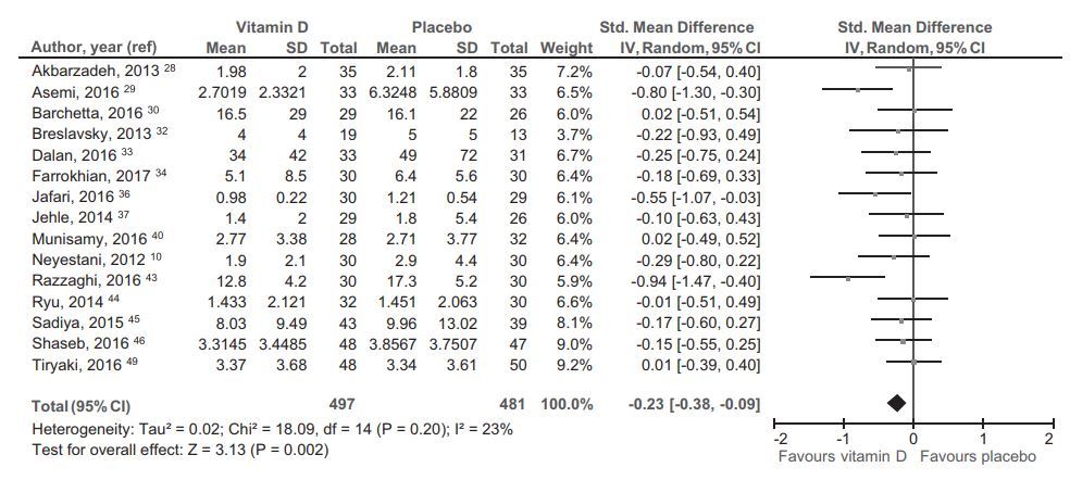 Twenty-eight RCTs were included, 20 of which had data available for pooling. In meta-analyses of 20 RCTs (n = 1270 participants), vitamin D-supplemented groups had lower levels of C-reactive protein (standardized mean difference [SMD] -0.23; 95%CI, -0.37 to -0.09; P = 0.002) and tumor necrosis factor α (SMD -0.49; 95%CI, -0.84 to -0.15; P = 0.005), a lower erythrocyte sedimentation rate (SMD -0.47; 95%CI, -0.89 to -0.05; P = 0.03), and higher levels of leptin (SMD 0.42; 95%CI, 0.04-0.81; P = 0.03) compared with control groups. No differences were observed for adiponectin, interleukin 6, or E-selectin (all P > 0.05). In meta-regression and subgroup analyses, age, sex, body mass index, duration of diabetes, baseline vitamin D status, and dose and duration of supplementation did not alter the results.CONCLUSIONS:
