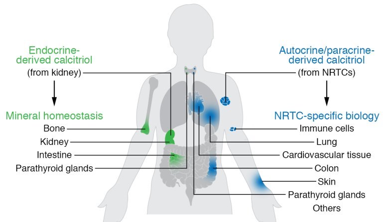 Research over the past several decades has suggested that the conversion of 25(OH) D3 to calcitriol also occurs in a myriad of nonrenal tissues and cells (NRTCs) that include the skin, parathyroid glands, bone cells, both cardiovascular and immune cells, and many others (2). The basis for this idea stems from initial immunocyto- chemical observations that indicate that CYP27B1 is also expressed in NRTCs, albeit at very low levels relative to levels in the primary renal source. Not surprisingly, these observations stimulated new research aimed at determining details of this previously undescribed source of calcitriol (3). This work has led to an important hypothesis proposing that renal endocrine calcitriol is predominantly linked to the regulation of mineral metabolism, whereas local NRTC production of this hormone may be central to the control of the numerous noncalcemic biological activities identified in these cell types (Figure 1).