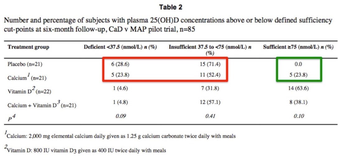 Statistically underpowered but supportive evidence that calcium improves 25(OH)D.As can be seen when comparing the data in the red square to that in the green square, the placebo group had zero people with “sufficient” 25(OH)D, while the calcium supplementation group had five fewer people in the “deficient” and “insufficient” ranges, with those five missing folks being found — score! — in the “sufficient” range.