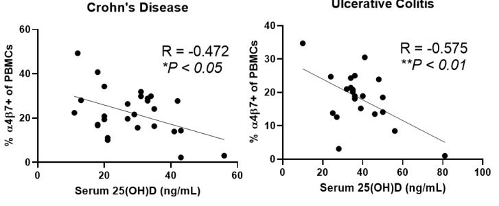 Results: Immunophenotyping revealed that higher 25(OH)D was associated with decreased α4β7+ peripheral blood mononuclear cells (R = -0.400, P < 0.01) and α4β7+ intestinal leukocytes (R = -0.538, P= 0.03). Serum 25(OH)D was inversely associated with α4β7+ peripheral B cells and natural killer (NK) cells and α4β7+ intestinal B cells, NK cells, monocytes, and macrophages. Mucosal expression of VDR was inversely associated with ITGA4 and ITGB7 expression. In multivariate analysis, 25(OH)D < 25 ng/mL was associated with increased vedolizumab primary non-response during induction (OR 26.10, 95% CI 14.30-48.90, P<0.001) and failure at 1-year follow-up (OR 6.10, 95% CI 3.06-12.17, P<0.001).