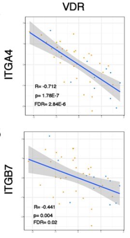Methods: We performed single-cell immunophenotyping of peripheral and intestinal immune cells using mass cytometry (CyTOF) in vedolizumab-naïve patients with IBD (N=48). We analyzed whole-genome mucosal gene expression (GSE73661) from GEMINI I and GEMINI long-term safety (LTS) to determine the association between vitamin D receptor (VDR) and integrin alpha-4 (ITGA4) and beta-7 (ITGB7) genes. We estimated the odds of vedolizumab failure with low pre-treatment vitamin D in a combined retrospective and prospective IBD cohort (N= 252) with logistic regression.