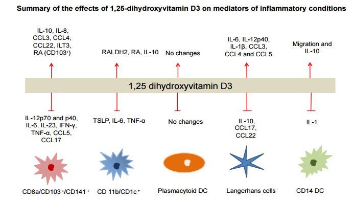 Studies over the last two decades have revealed profound immunomodulatory aspects of vitamin D on various aspects of the immune system. This review will provide an overview of Vitamin D metabolism, a description of dendritic cell subsets, and highlight recent advances on the effects of vitamin D on dendritic cell function, maturation, cytokine production and antigen presentation. The active form of vitamin D, 1,25(OH)2D3, has important immunoregulatory and anti-inflammatory effects. Specifically, the 1,25(OH)2D3-Vitamin D3 complex can affect the maturation and migration of many dendritic cell subsets, conferring a special immunoregulatory role as well as tolerogenic properties affecting cytokine and chemokine production. Furthermore, there have been many recent studies demonstrating the effects of Vitamin D on allergic disease and autoimmunity. A clear understanding of the effects of the various forms of Vitamin D will provide new opportunities to improve human health.
