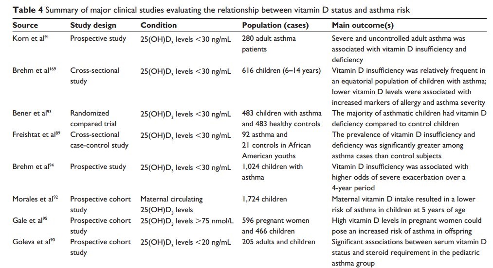 Table 4 Summary of major clinical studies evaluating the relationship between vitamin D status and asthma risk