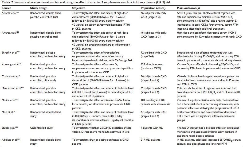 Several randomized, double-blind, placebo-controlled studies have examined the role of vitamin D as a therapeutic agent for CKD (Table 7).120,122-127 High-dose cholecalciferol supplementation (50,000 IU/week for 12 weeks) was safe and sufficient to maintain serum 25(OH)D3 concentrations ($ 30 ng/mL) and simultaneously decreased serum MCP-1 concentrations in early CKD.122-124 In moderate CKD patients, both cholecalciferol (vitamin D3) and ergocalcif-erol (vitamin D2) are effective in increasing 25(OH)D3 and decreasing parathyroid hormone and inflammatory cytokine levels.125,127 In nonhemodialysis patients, supplementation of cholecalciferol with 40,000 IU/week for 8 weeks significantly increased the level of 1,25(OH)2D3 and decreased serum parathyroid hormone and inflammatory cytokine levels.126 However, this effect was not observed in end-stage renal disease (ESRD) patients.126 As patients with CKD progress to ESRD, renal CYP27B1 activity decreases, resulting in the impaired formation of 1,25(OH)2D3 in many of these patients.128Table 6 Summary of major clinical studies evaluating the relationship between vitamin D status and chronic kidney disease (CKD) risk