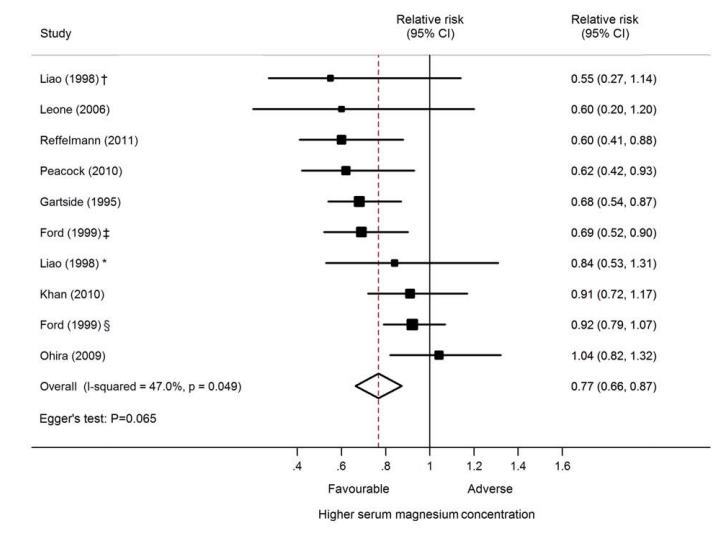 BACKGROUND: Prospective studies that have examined the association between dietary magnesium intake and serum magnesium concentrations and the risk of cardiovascular disease (CVD) events have reported conflicting findings. We undertook a meta-analysis to evaluate the association between dietary magnesium intake and serum magnesium concentrations and the risk of total CVD events.