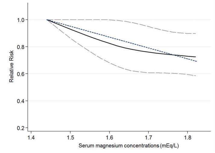 Serum magnesium concentrations are linearly and inversely associated with the risk of total CVD events.