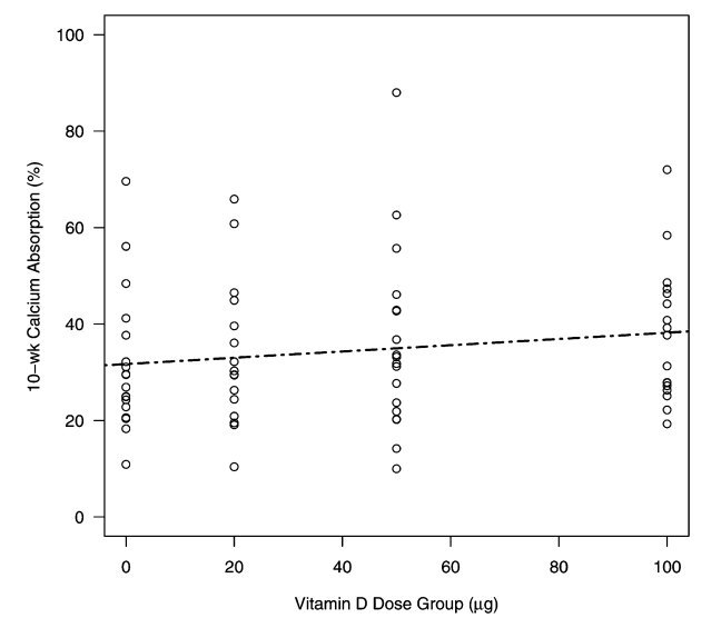 Results: Seventy-one women with a mean ± SD age of 58.8 ± 4.9 y completed the study. The mean calcium intake was 1142 ± 509 mg/d and serum 25(OH)D was 63 ± 14 nmol/L at baseline. A statistically significant linear trend of an increase in calcium absorption adjusted for age and body mass index with increasing vitamin D3 dose or serum 25(OH)D concentration was observed. A 6.7% absolute increase in calcium absorption was found in the highest vitamin D3 group (100 μg).