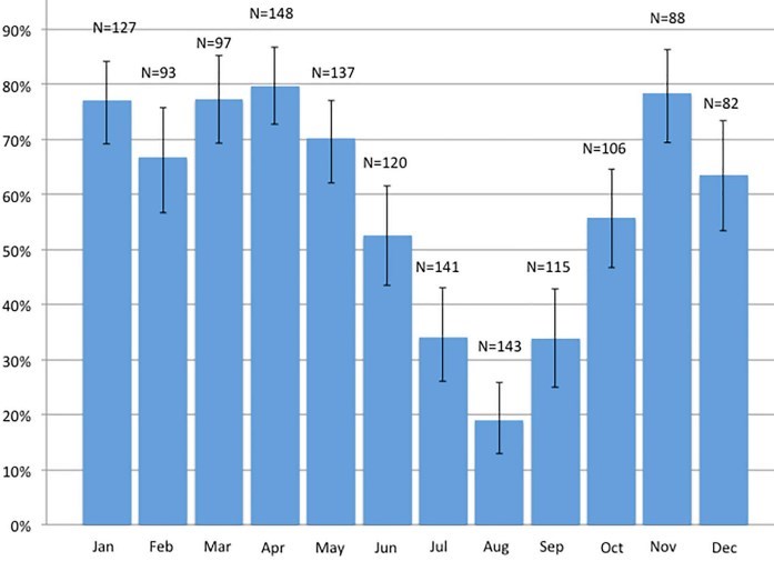Fifty eight per cent of the women had serum vitamin D levels <50 nmol/L. The proportion of women with vitamin D deficiency varied, as expected, with season. No association between vitamin D deficiency and postpartum infections was found. For vitamin D 25–50 nmol/L the adjusted Odds Ratio was 0.85 (95% confidence interval 0.56–1.29) and for vitamin D <25 nmol/L the adjusted Odds Ratio was 1.15 (95% confidence interval 0.66–2.03). Women who smoked or who had a cesarean section had an increased risk of postpartum infections.