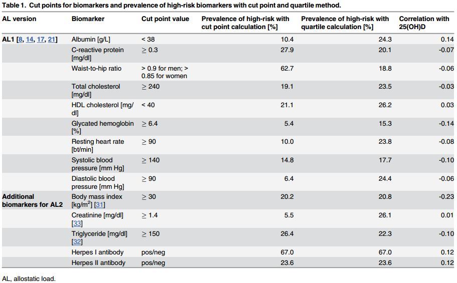 METHODS: Data from the Third National Health and Nutrition Examination Survey (NHANES III, 1988-94) were used to calculate two versions of AL including 9 biomarkers and another two with 14 biomarkers (systolic and diastolic blood pressure, pulse rate, serum cholesterol, serum HDL-cholesterol, glycated hemoglobin, sex-specific waist-to-hip ratio, serum albumin, and serum C-reactive protein for AL1, and, additionally body mass index, serum triglyceride, serum creatinine, and serum herpes I & II antibodies for AL2), each set defined by predefined cut-offs or by quartiles. Serum vitamin D concentration was ranked into quartiles. Logistic regression, Poisson regression and linear regression were used to examine the association of serum 25(OH)D concentrations on AL, after adjusting for biological, physiological, socioeconomic, lifestyle, and health variables.
