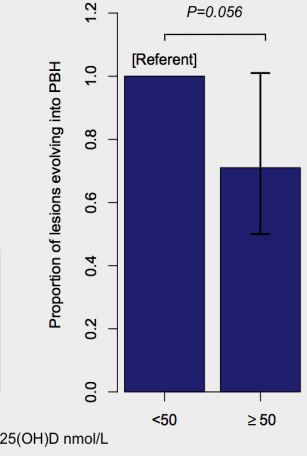 Results: A total of 3789 new lesions developed over the 5 year follow-up period with 383 developing into PBHs. Average 25(OH)D levels were significantly inversely correlated with the number of PBHs from the 6-month to five-year MRI; patients with serum 25(OH)D levels ≥50 nmol/L experienced a 55% lower absolute rate of PBHs (95% CI: 0.29 to 0.71; P=0.006) than those < 50 nmol/L. We also observed a marginal association between serum 25(OH)D and the proportion of T2 lesions evolving into PBHs (0.71; 95% CI: 0.50 to 1.01; P=0.056, comparing patients with ≥50 nmol/L vs those < 50 nmol/L). We found generally similar associations between patients with serum 25(OH)D levels ≥50 nmol/L and the number of each of the 4 lesion types at presentation (for any T1-hypointense lesions: 0.54; 95% CI:0.54-0.91; for T1-isointense lesions: 0.63; 95% CI:0.47-0.85; for nodular Gd+ lesions: 0.67; 95% CI:0.47-0.98; for ring-like-Gd+ lesions: 0.79; 95% CI: 0.47-1.35).