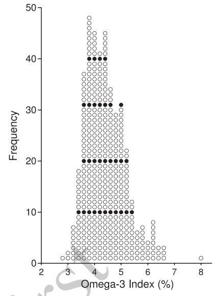 Figure. Histogram of Omega-3 Index in a sample of collegiate football athletes (n = 404).We measured the ffl-3 FA status, specifically EPA and DHA, as well as the FA profile of a large cohort of NCAA football athletes. To our knowledge, this is the first investigation of the ffl-3 FA status of a representative group of NCAA football athletes. Our main finding was that none of the football athletes had an Omega-3 Index above the targeted value for a reduction in CVD risk (8%).