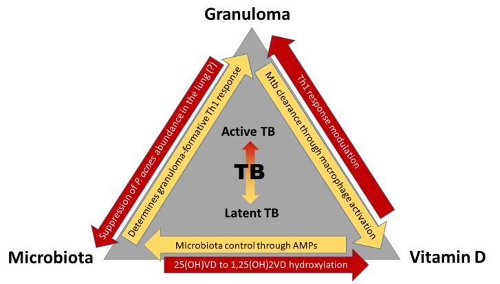 Mycobacterium tuberculosis (Mtb) has the extraordinary ability to persist for decades within granulomas in the human host. These histopathological structures involved in both protection and pathogenesis, are subject to various influences from the host systemically and through micro-niche environments. Despite the fact that vitamin D (VD) has a key role in macrophage activation and mycobacterial clearance in the early stages of Mtb infection, the overall role of VD in granuloma maintenance or functionality has been scarcely studied. VD deficiency has long time been known to influence on gut microbiota composition, and recent studies have shown that it can also impact on respiratory microbiome. The human microbiota plays an important role in pathogen colonization resistance, and it has been proposed to play a potential role in TB pathogenesis.