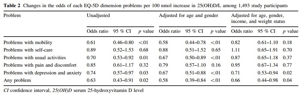 Participants with higher serum 25(OH)D levels were significantly less likely to report problems with mobility, usual activities, and depression and anxiety. Specifically, age- and gender-adjusted odds ratios for reporting problems with mobility, usual activities, and depression and anxiety were 0.58 (95 % confidence interval 0.44-0.78), 0.67 (0.50-0.89), and 0.67 (0.51-0.88) per 100 nmol/L increase in 25(OH)D, respectively. No significant associations were observed for problems with self-care and with pain and discomfort. HRQOL scores combining the responses of each of the five dimensions increased significantly with increasing serum 25(OH)D levels.