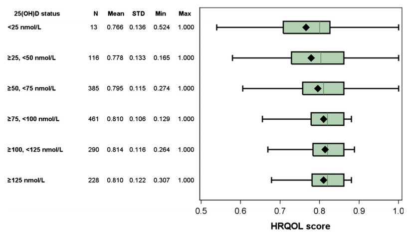 We analysed baseline data of 1,493 Canadians aged 50 years and over in Alberta on HRQOL (EQ-5D-5L) and serum 25-hydroxyvitamin D (25(OH)D) as a measure of vitamin D status. We applied multivariable regression methods to examine the association between vitamin D status and each of the five dimensions and the summary index of the EQ-5D-5L.