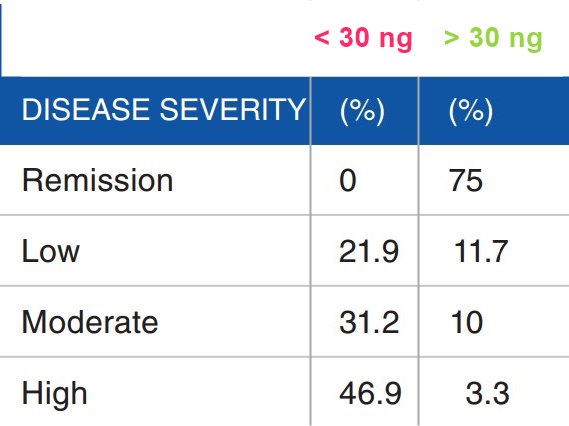 Results: The mean age of the patients was 53.05 ± 12.33 years and most of them (58.7%) were women. Serum vitamin D level was sufficient in 65.2% of patients and the severity of the disease was in the remission in 48.9% of them. The results of chi-square test showed a significant relationship between serum vitamin D levels and disease severity in patients (P < .001).
