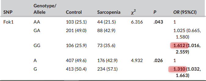 Results: Fok1, but not Bsm1, polymorphism was significantly associated with sarcopenia. Patients with Fok1 GG genotype were more likely to have sarcopenia. Both Bsm1 and Fok1 polymorphism were related to muscle traits. Patients with Bsm1 CT genotype had lower gait speed (GS) but higher skeletal mass index. Patients with Fok1 GG genotype had lower GS, and female subjects with the Fok1 GG genotype had lower handgrip strength (HS). GS was decreased in Bsm1 CT genotype than CC carriers. HS and GS were decreased in Fok1 GG genotype than AA carriers.