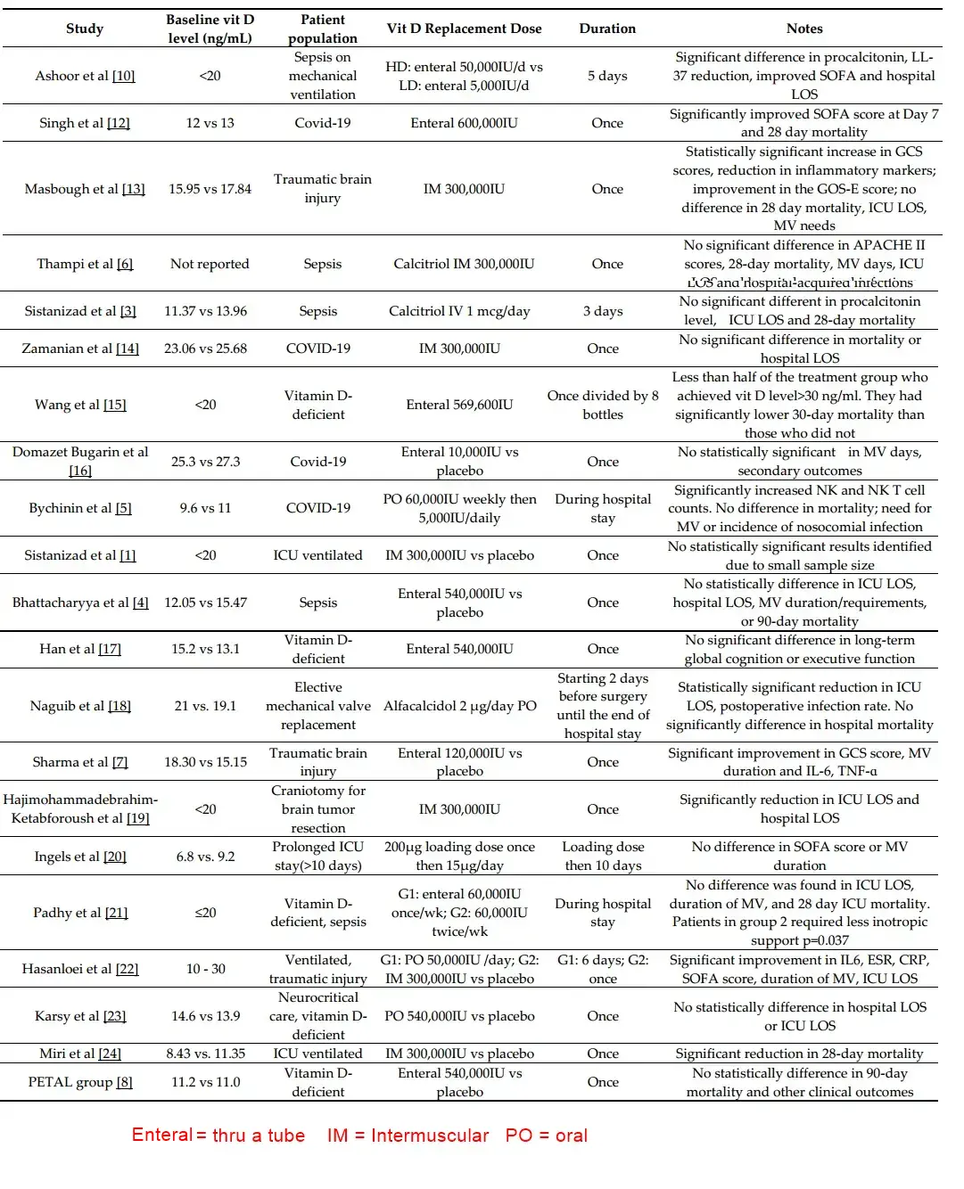Overall, conflicting results were demonstrated in the randomized controlled trials in the past 5 years regarding the clinical impact of vitamin D replacement on critically ill patients. Several studies showed vitamin D replacement has positive results in biomarkers such as procalcitonin, Cathelicidin LL-37, neutrophil-to-lymphocyte ratio(NLR) and platelet-to-lymphocyte ratio (PLR) levels [27]. Other studies demonstrated that vitamin D improved SOFA score, GCS score, post-op infection rate, duration of mechanical ventilation, and ICU and hospital length of stay [24].