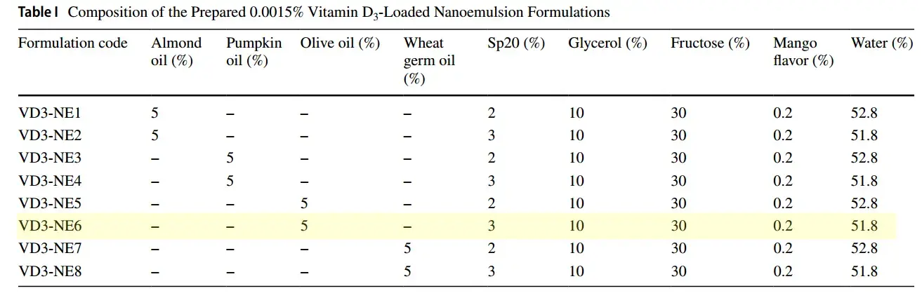 The aim of the current study is the development of a vitamin D3 (VD3)-loaded nanoemulsion (NE) formulation to improve VD3 oral bioavailability for management of vitamin D inadequacy in autistic children. Eight NE formulations were prepared by high-speed homogenization followed by ultrasonication. Four vegetable oils were employed along with two concentrations of Span 20 as the emulsifier. Glycerol, fructose, and mango flavor were included as viscosity modifier, sweetening, and flavoring agents, respectively. The prepared VD3-loaded NE formulations exhibited high drug content (> 98%), droplet size (DS) ranging from 61.15 to 129.8 nm with narrow size distribution, zeta potential values between − 9.83 and − 19.22 mV, and acceptable pH values (4.59–5.89). Storage stability showed that NE formulations underwent coalescence and phase separation during 6 months at room temperature, whereas at refrigerated conditions, formulations showed slight creaming.