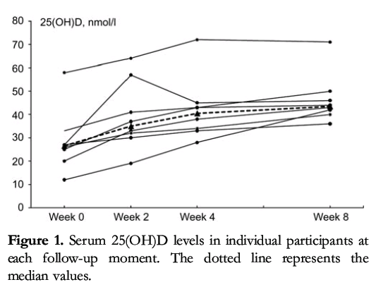 RESULTS: at baseline, mean serum 25(OH)D was 28.5 nmol/l. Mean serum 25(OH)D levels increased to 46.5 nmol/l. Median serum PTH levels decreased by 20% after 8 weeks of treatment.