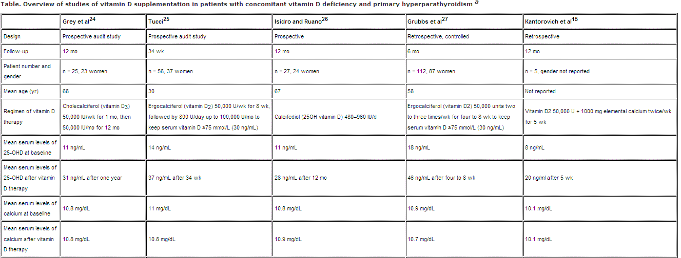 25. Tucci JR. Vitamin D therapy in patients with primary hyperparathyroidism and hypovitaminosis D. Eur J Endocrinol 2009;161:189–193.