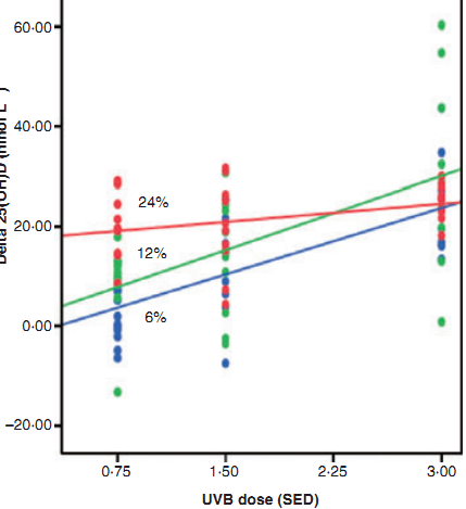 Fig 1. Relationship between the increase in vitamin D (25-hydroxyvitamin-D3; D25(OH)D) and the ultraviolet (UV) B dose of
