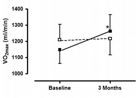 - maximal oxygen uptake (110 +/- 211 ml/min vs -20 +/- 187 ml/min; p = 0.029).