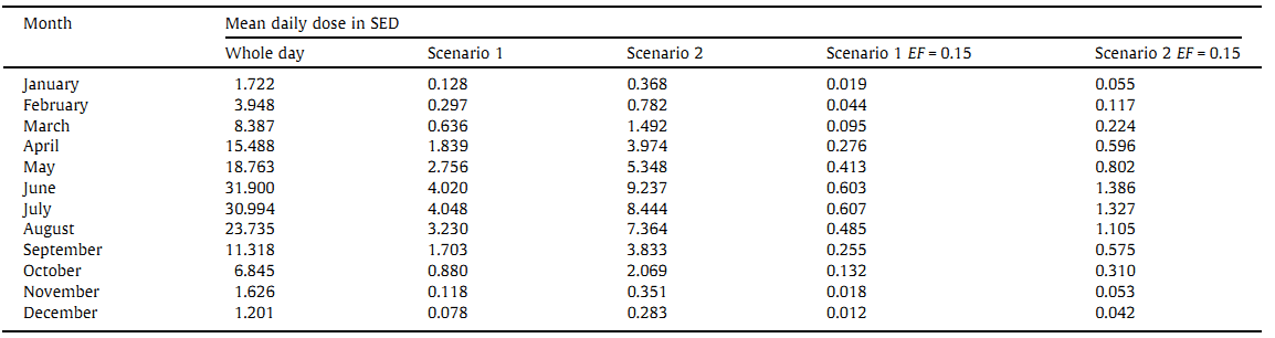 Monthly means of daily erythemaly weighted doses from the measurements carried out in Belsk, central Poland, in 2010 for the following scenarios: the whole day insolation (from sunrise up to sunset), scenario 1 - the outdoor activity in the periods 7.30-8.00 am + 3.00-3.30 pm in working days and 1 h (cold subperiod of the year) or 2 h (warm subperiod, 15.04-15.10) around noon in weekends, scenario 2-outdoor activity 1 h and 2 h around noon in all days in cold and warm subperiod of the year, respectively. For scenario 1 and 2, the exposure fraction (EF) of 0.15 is assumed.