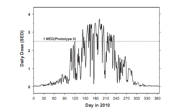 In our model, the solar forcing is described in the SDD units, whereas the UV exposures in SED units were used in Diffey's model. Recent work has suggested that the vitamin D weighted doses are more appropriate, when analyzing the cutaneous synthesis of vitamin D. It means that 1-MED radiative forcing in summer has a higher potential to produce vitamin D, compared to a 1-MED source in winter. Thus, the solar exposure, expressed in MED, should be larger in winter, than that in summer, to produce the same vitamin D effect [41].
