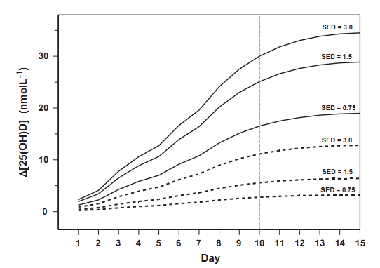 • the linear dependence between the serum 25(OH)D concentration and the area of skin open to sunlight is kept, for low UV exposure, below the exposure threshold of 1.95 SDD.