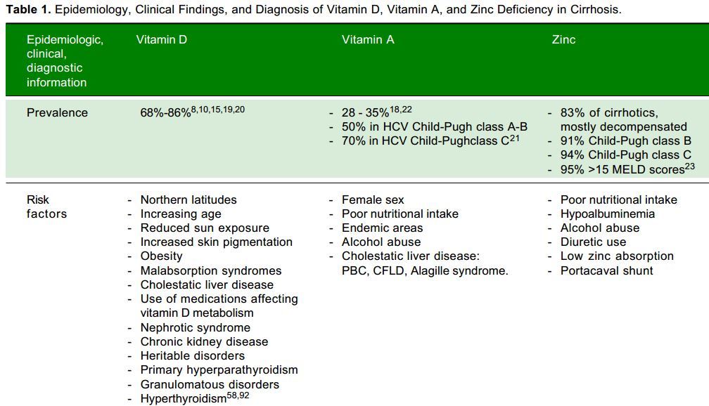 Download the PDF from VitaminDWikiMalnutrition is prevalent in cirrhosis. Vitamin and mineral deficiencies, including vitamin D, vitamin A, and zinc, are common and have been shown to correlate with survival. Our aim was to review the mechanisms of vitamin D, vitamin A, and zinc deficiencies in cirrhosis and the clinical assessment of affected patients, their outcomes based on the current literature, and management. This is a narrative review including the relevant literature for cirrhosis and vitamin D, vitamin A, and zinc deficiencies. Vitamin D deficiency has important effects in cirrhosis, regardless of the cause of chronic liver disease.These effects include associations with fibrosis and outcomes such as infections, hepatocellular carcinoma, and mortality. Vitamin A deficiency is associated with liver disease progression to cirrhosis and clinical decompensation, including occurrence of ascites or hepatic encephalopathy. Zinc deficiency can lead to hepatic encephalopathy and impaired immune function. Such deficiencies correlate with patient survival and disease severity. Caution should be applied when replacing vitamin D, vitamin A, and zinc to avoid toxicity. Identification and appropriate treatment of vitamin and mineral deficiencies in cirrhosis may reduce specific nutritional and cirrhosis-related adverse events. Routine monitoring of vitamin A, vitamin D and zinc levels in cirrhosis should be considered.