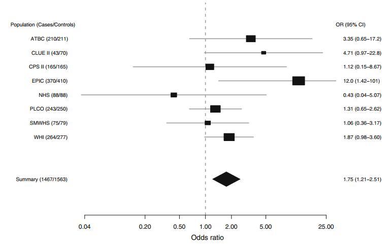 The pooled data included 1,621 pancreatic adenocarcinoma cases and 1,719 matched controls from twelve cohorts using a nested case–control study design. Subjects who were diagnosed with diabetes near the time (<2 years) of pancreatic cancer diagnosis were excluded from all analyses. All analyses were adjusted for age, race, gender, study, alcohol use, smoking, BMI, and family history of pancreatic cancer.
